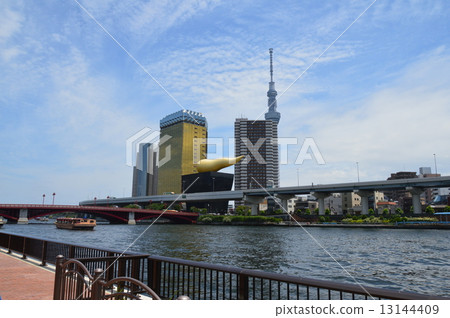 朝日啤酒塔 左 超級乾燥廳 前 天空樹 右 Azumabashi Toei 照片素材 圖片 圖庫